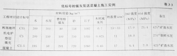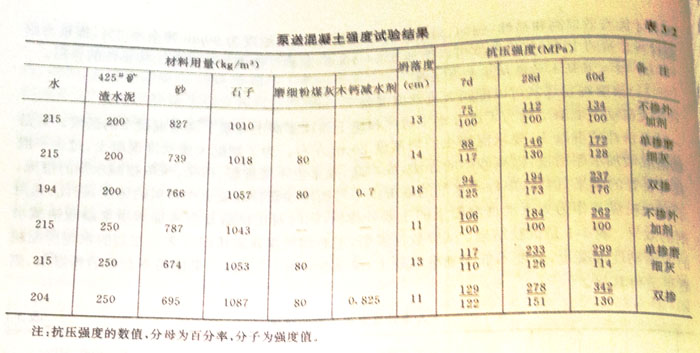 可泵性主要決定于混凝土與管壁之間的摩擦力。由于低標號混凝土的水泥用量少,可泵性差,因此,過去規(guī)定C15以下的混凝土不得泵送??墒菗饺绶勖夯液蜏p水機劑后,可使混凝土在不增加水泥的情況下仍能獲得良好的可泵性。在寶電工程中,C2.5、C5和C15的混凝土在300m水平硬管輸送時也沒有發(fā)生堵塞現(xiàn)在。表3—3是低標號粉煤灰泵送混凝土的施工實例。
